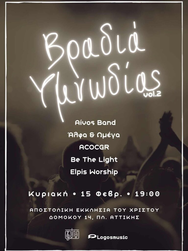 Μια βραδιά λατρείας και ενότητας, αφιερωμένη στο φως και την ελπίδα. Ελάτε να υψώσουμε τη φωνή και την καρδιά μας μέσα από ύμνους και δοξολογία, μαζί μας οι Aívos Band, Άλφα & Ωμέγα, ACOCGR, Be The Light και Elpis Worship.